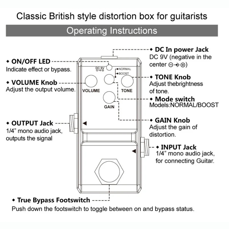 - Gain Knob: Adjusts the gain level of distortion.